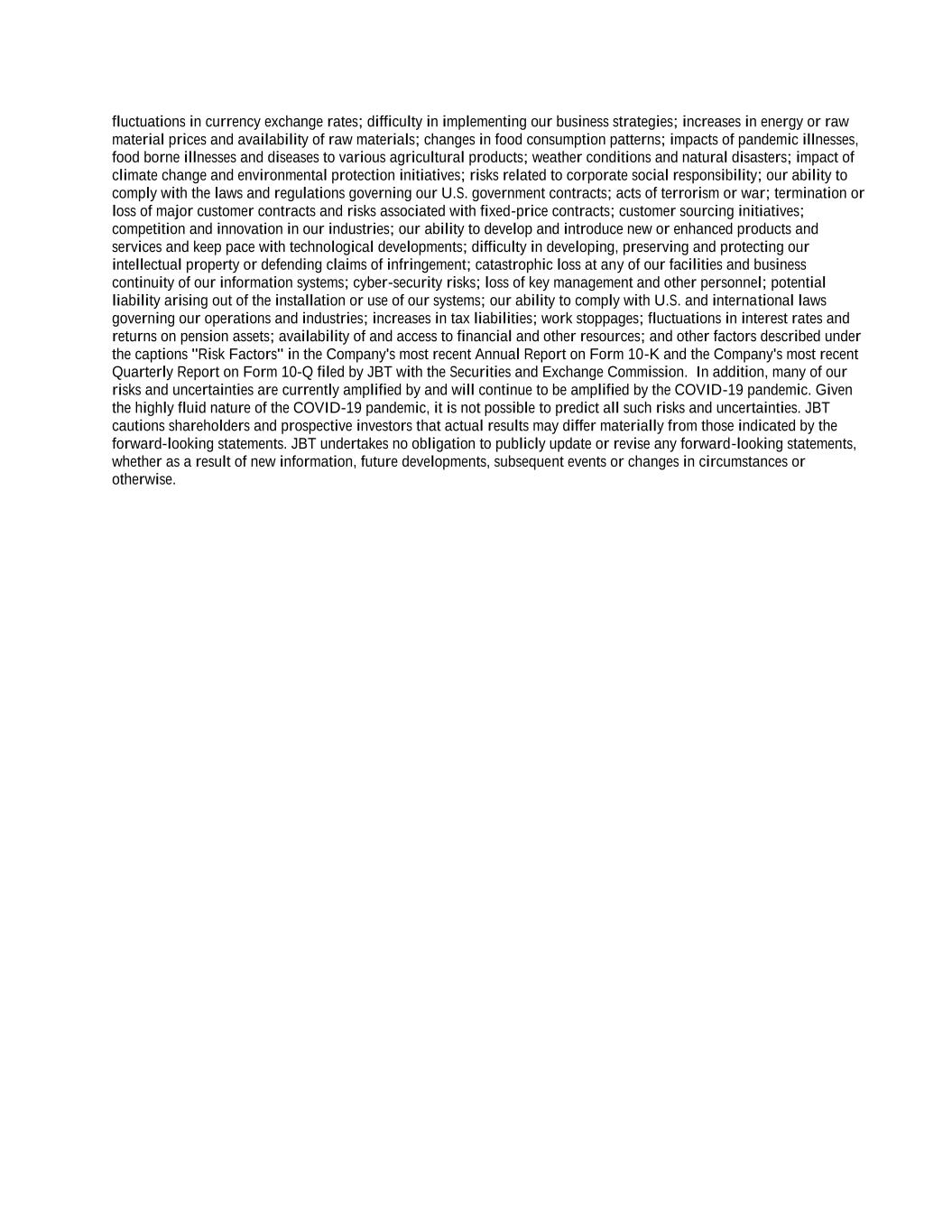 fluctuations in currency exchange rates; difficulty in implementing our business strategies; increases in energy or raw material prices and availability of raw materials; changes in food consumption patterns; impacts of pandemic illnesses, food borne illnesses and diseases to various agricultural products; weather conditions and natural disasters; impact of climate change and environmental protection initiatives; risks related to corporate social responsibility; our ability to comply with the laws and regulations governing our U.S. government contracts; acts of terrorism or war; termination or loss of major customer contracts and risks associated with fixed-price contracts; customer sourcing initiatives; competition and innovation in our industries; our ability to develop and introduce new or enhanced products and services and keep pace with technological developments; difficulty in developing, preserving and protecting our intellectual property or defending claims of infringement; catastrophic loss at any of our facilities and business continuity of our information systems; cyber-security risks; loss of key management and other personnel; potential liability arising out of the installation or use of our systems; our ability to comply with U.S. and international laws governing our operations and industries; increases in tax liabilities; work stoppages; fluctuations in interest rates and returns on pension assets; availability of and access to financial and other resources; and other factors described under the captions "Risk Factors" in the Company's most recent Annual Report on Form 10-K and the Company's most recent Quarterly Report on Form 10-Q filed by JBT with the Securities and Exchange Commission. In addition, many of our risks and uncertainties are currently amplified by and will continue to be amplified by the COVID-19 pandemic. Given the highly fluid nature of the COVID-19 pandemic, it is not possible to predict all such risks and uncertainties. JBT cautions shareholders and prospective investors that actual results may differ materially from those indicated by the forward-looking statements. JBT undertakes no obligation to publicly update or revise any forward-looking statements, whether as a result of new information, future developments, subsequent events or changes in circumstances or otherwise.