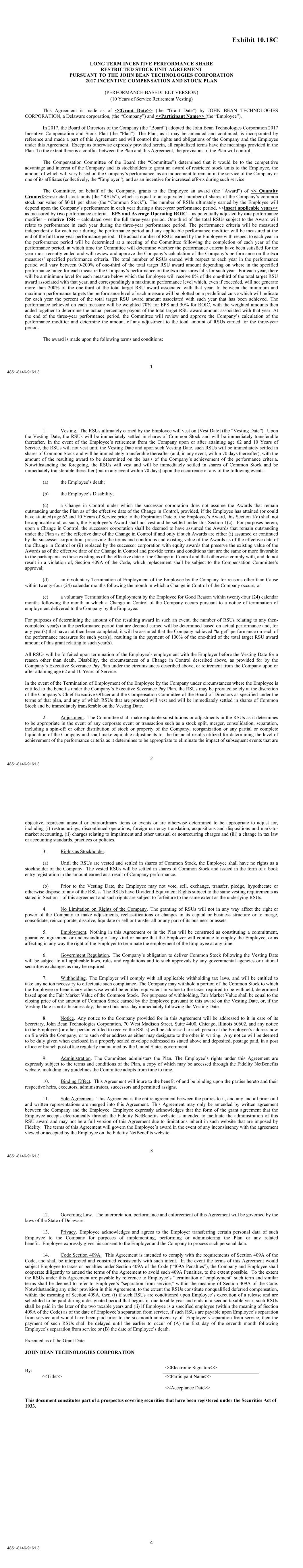 1 4851-8146-9161.3 Exhibit 10.18C LONG TERM INCENTIVE PERFORMANCE SHARE RESTRICTED STOCK UNIT AGREEMENT PURSUANT TO THE JOHN BEAN TECHNOLOGIES CORPORATION 2017 INCENTIVE COMPENSATION AND STOCK PLAN (PERFORMANCE-BASED: ELT VERSION) (10 Years of Service Retirement Vesting) This Agreement is made as of <<Grant Date>> (the “Grant Date”) by JOHN BEAN TECHNOLOGIES CORPORATION, a Delaware corporation, (the “Company”) and <<Participant Name>> (the “Employee”). In 2017, the Board of Directors of the Company (the “Board”) adopted the John Bean Technologies Corporation 2017 Incentive Compensation and Stock Plan (the “Plan”). The Plan, as it may be amended and continued, is incorporated by reference and made a part of this Agreement and will control the rights and obligations of the Company and the Employee under this Agreement. Except as otherwise expressly provided herein, all capitalized terms have the meanings provided in the Plan. To the extent there is a conflict between the Plan and this Agreement, the provisions of the Plan will control. The Compensation Committee of the Board (the “Committee”) determined that it would be to the competitive advantage and interest of the Company and its stockholders to grant an award of restricted stock units to the Employee, the amount of which will vary based on the Company’s performance, as an inducement to remain in the service of the Company or one of its affiliates (collectively, the “Employer”), and as an incentive for increased efforts during such service. The Committee, on behalf of the Company, grants to the Employee an award (the “Award”) of << Quantity Granted>>restricted stock units (the “RSUs”), which is equal to an equivalent number of shares of the Company’s common stock par value of $0.01 per share (the “Common Stock”). The number of RSUs ultimately earned by the Employee will depend upon the Company’s performance in each year during a three-year performance period, <<insert applicable years>> as measured by two performance criteria – EPS and Average Operating ROIC – as potentially adjusted by one performance modifier – relative TSR – calculated over the full three-year period. One-third of the total RSUs subject to the Award will relate to performance in each year during the three-year performance period. The performance criteria will be measured independently for each year during the performance period and any applicable performance modifier will be measured at the end of the full three-year performance period. The actual number of RSUs earned by the Employee with respect to each year in the performance period will be determined at a meeting of the Committee following the completion of each year of the performance period, at which time the Committee will determine whether the performance criteria have been satisfied for the year most recently ended and will review and approve the Company’s calculation of the Company’s performance on the two measures’ specified performance criteria. The total number of RSUs earned with respect to each year in the performance period will vary between 0-200% of one-third of the total target RSU award amount depending on where in the specified performance range for each measure the Company’s performance on the two measures falls for such year. For each year, there will be a minimum level for each measure below which the Employee will receive 0% of the one-third of the total target RSU award associated with that year, and correspondingly a maximum performance level which, even if exceeded, will not generate more than 200% of the one-third of the total target RSU award associated with that year. In between the minimum and maximum performance targets the performance level of each measure will be plotted on a predefined curve which will indicate for each year the percent of the total target RSU award amount associated with such year that has been achieved. The performance achieved on each measure will be weighted 70% for EPS and 30% for ROIC, with the weighted amounts then added together to determine the actual percentage payout of the total target RSU award amount associated with that year. At the end of the three-year performance period, the Committee will review and approve the Company’s calculation of the performance modifier and determine the amount of any adjustment to the total amount of RSUs earned for the three-year period. The award is made upon the following terms and conditions: 2 4851-8146-9161.3 1. Vesting. The RSUs ultimately earned by the Employee will vest on [Vest Date] (the “Vesting Date”). Upon the Vesting Date, the RSUs will be immediately settled in shares of Common Stock and will be immediately transferable thereafter. In the event of the Employee’s retirement from the Company upon or after attaining age 62 and 10 Years of Service, the RSUs will not vest until the Vesting Date and upon such Vesting Date, such RSUs will be immediately settled in shares of Common Stock and will be immediately transferable thereafter (and, in any event, within 70 days thereafter), with the amount of the resulting award to be determined on the basis of the Company’s achievement of the performance criteria. Notwithstanding the foregoing, the RSUs will vest and will be immediately settled in shares of Common Stock and be immediately transferable thereafter (but in any event within 70 days) upon the occurrence of any of the following events: (a) the Employee’s death; (b) the Employee’s Disability; (c) a Change in Control under which the successor corporation does not assume the Awards that remain outstanding under the Plan as of the effective date of the Change in Control, provided, if the Employee has attained (or could have attained) age 62 and 10 Years of Service prior to the Expiration Date of the Employee’s Award, this Section 1(c) shall not be applicable and, as such, the Employee’s Award shall not vest and be settled under this Se