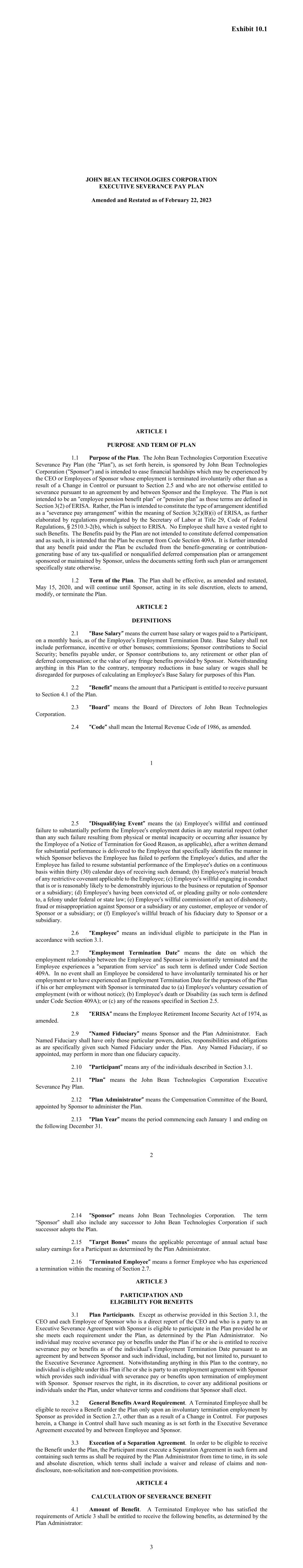 Exhibit 10.1 JOHN BEAN TECHNOLOGIES CORPORATION EXECUTIVE SEVERANCE PAY PLAN Amended and Restated as of February 22, 2023 1 ARTICLE 1 PURPOSE AND TERM OF PLAN 1.1 Purpose of the Plan. The John Bean Technologies Corporation Executive Severance Pay Plan (the “Plan”), as set forth herein, is sponsored by John Bean Technologies Corporation (“Sponsor”) and is intended to ease financial hardships which may be experienced by the CEO or Employees of Sponsor whose employment is terminated involuntarily other than as a result of a Change in Control or pursuant to Section 2.5 and who are not otherwise entitled to severance pursuant to an agreement by and between Sponsor and the Employee. The Plan is not intended to be an “employee pension benefit plan” or “pension plan” as those terms are defined in Section 3(2) of ERISA. Rather, the Plan is intended to constitute the type of arrangement identified as a “severance pay arrangement” within the meaning of Section 3(2)(B)(i) of ERISA, as further elaborated by regulations promulgated by the Secretary of Labor at Title 29, Code of Federal Regulations, § 2510.3-2(b), which is subject to ERISA. No Employee shall have a vested right to such Benefits. The Benefits paid by the Plan are not intended to constitute deferred compensation and as such, it is intended that the Plan be exempt from Code Section 409A. It is further intended that any benefit paid under the Plan be excluded from the benefit-generating or contribution- generating base of any tax-qualified or nonqualified deferred compensation plan or arrangement sponsored or maintained by Sponsor, unless the documents setting forth such plan or arrangement specifically state otherwise. 1.2 Term of the Plan. The Plan shall be effective, as amended and restated, May 15, 2020, and will continue until Sponsor, acting in its sole discretion, elects to amend, modify, or terminate the Plan. ARTICLE 2 DEFINITIONS 2.1 “Base Salary” means the current base salary or wages paid to a Participant, on a monthly basis, as of the Employee’s Employment Termination Date. Base Salary shall not include performance, incentive or other bonuses; commissions; Sponsor contributions to Social Security; benefits payable under, or Sponsor contributions to, any retirement or other plan of deferred compensation; or the value of any fringe benefits provided by Sponsor. Notwithstanding anything in this Plan to the contrary, temporary reductions in base salary or wages shall be disregarded for purposes of calculating an Employee’s Base Salary for purposes of this Plan. 2.2 “Benefit” means the amount that a Participant is entitled to receive pursuant to Section 4.1 of the Plan. 2.3 “Board” means the Board of Directors of John Bean Technologies Corporation. 2.4 “Code” shall mean the Internal Revenue Code of 1986, as amended. 2 2.5 “Disqualifying Event” means the (a) Employee’s willful and continued failure to substantially perform the Employee’s employment duties in any material respect (other than any such failure resulting from physical or mental incapacity or occurring after issuance by the Employee of a Notice of Termination for Good Reason, as applicable), after a written demand for substantial performance is delivered to the Employee that specifically identifies the manner in which Sponsor believes the Employee has failed to perform the Employee’s duties, and after the Employee has failed to resume substantial performance of the Employee’s duties on a continuous basis within thirty (30) calendar days of receiving such demand; (b) Employee’s material breach of any restrictive covenant applicable to the Employee; (c) Employee’s willful engaging in conduct that is or is reasonably likely to be demonstrably injurious to the business or reputation of Sponsor or a subsidiary; (d) Employee’s having been convicted of, or pleading guilty or nolo contendere to, a felony under federal or state law; (e) Employee’s willful commission of an act of dishonesty, fraud or misappropriation against Sponsor or a subsidiary or any customer, employee or vendor of Sponsor or a subsidiary; or (f) Employee’s willful breach of his fiduciary duty to Sponsor or a subsidiary. 2.6 “Employee” means an individual eligible to participate in the Plan in accordance with section 3.1. 2.7 “Employment Termination Date” means the date on which the employment relationship between the Employee and Sponsor is involuntarily terminated and the Employee experiences a “separation from service” as such term is defined under Code Section 409A. In no event shall an Employee be considered to have involuntarily terminated his or her employment or to have experienced an Employment Termination Date for the purposes of the Plan if his or her employment with Sponsor is terminated due to (a) Employee’s voluntary cessation of employment (with or without notice); (b) Employee’s death or Disability (as such term is defined under Code Section 409A); or (c) any of the reasons specified in Section 2.5. 2.8 “ERISA” means the Employee Retirement Income Security Act of 1974, as amended. 2.9 “Named Fiduciary” means Sponsor and the Plan Administrator. Each Named Fiduciary shall have only those particular powers, duties, responsibilities and obligations as are specifically given such Named Fiduciary under the Plan. Any Named Fiduciary, if so appointed, may perform in more than one fiduciary capacity. 2.10 “Participant” means any of the individuals described in Section 3.1. 2.11 “Plan” means the John Bean Technologies Corporation Executive Severance Pay Plan. 2.12 “Plan Administrator” means the Compensation Committee of the Board, appointed by Sponsor to administer the Plan. 2.13 “Plan Year” means the period commencing each January 1 and ending on the following December 31. 3 2.14 “Sponsor” means John Bean Technologies Corporation. The term “Sponsor” shall also include any successor to John Bea