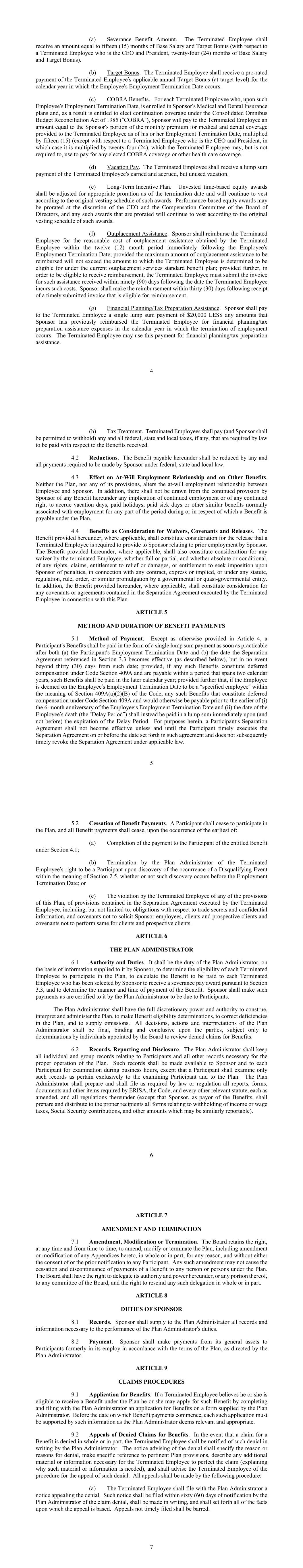 4 (a) Severance Benefit Amount. The Terminated Employee shall receive an amount equal to fifteen (15) months of Base Salary and Target Bonus (with respect to a Terminated Employee who is the CEO and President, twenty-four (24) months of Base Salary and Target Bonus). (b) Target Bonus. The Terminated Employee shall receive a pro-rated payment of the Terminated Employee’s applicable annual Target Bonus (at target level) for the calendar year in which the Employee’s Employment Termination Date occurs. (c) COBRA Benefits. For each Terminated Employee who, upon such Employee’s Employment Termination Date, is enrolled in Sponsor’s Medical and Dental Insurance plans and, as a result is entitled to elect continuation coverage under the Consolidated Omnibus Budget Reconciliation Act of 1985 (“COBRA”), Sponsor will pay to the Terminated Employee an amount equal to the Sponsor’s portion of the monthly premium for medical and dental coverage provided to the Terminated Employee as of his or her Employment Termination Date, multiplied by fifteen (15) (except with respect to a Terminated Employee who is the CEO and President, in which case it is multiplied by twenty-four (24), which the Terminated Employee may, but is not required to, use to pay for any elected COBRA coverage or other health care coverage. (d) Vacation Pay. The Terminated Employee shall receive a lump sum payment of the Terminated Employee’s earned and accrued, but unused vacation. (e) Long-Term Incentive Plan. Unvested time-based equity awards shall be adjusted for appropriate proration as of the termination date and will continue to vest according to the original vesting schedule of such awards. Performance-based equity awards may be prorated at the discretion of the CEO and the Compensation Committee of the Board of Directors, and any such awards that are prorated will continue to vest according to the original vesting schedule of such awards. (f) Outplacement Assistance. Sponsor shall reimburse the Terminated Employee for the reasonable cost of outplacement assistance obtained by the Terminated Employee within the twelve (12) month period immediately following the Employee’s Employment Termination Date; provided the maximum amount of outplacement assistance to be reimbursed will not exceed the amount to which the Terminated Employee is determined to be eligible for under the current outplacement services standard benefit plan; provided further, in order to be eligible to receive reimbursement, the Terminated Employee must submit the invoice for such assistance received within ninety (90) days following the date the Terminated Employee incurs such costs. Sponsor shall make the reimbursement within thirty (30) days following receipt of a timely submitted invoice that is eligible for reimbursement. (g) Financial Planning/Tax Preparation Assistance. Sponsor shall pay to the Terminated Employee a single lump sum payment of $20,000 LESS any amounts that Sponsor has previously reimbursed the Terminated Employee for financial planning/tax preparation assistance expenses in the calendar year in which the termination of employment occurs. The Terminated Employee may use this payment for financial planning/tax preparation assistance. 5 (h) Tax Treatment. Terminated Employees shall pay (and Sponsor shall be permitted to withhold) any and all federal, state and local taxes, if any, that are required by law to be paid with respect to the Benefits received. 4.2 Reductions. The Benefit payable hereunder shall be reduced by any and all payments required to be made by Sponsor under federal, state and local law. 4.3 Effect on At-Will Employment Relationship and on Other Benefits. Neither the Plan, nor any of its provisions, alters the at-will employment relationship between Employee and Sponsor. In addition, there shall not be drawn from the continued provision by Sponsor of any Benefit hereunder any implication of continued employment or of any continued right to accrue vacation days, paid holidays, paid sick days or other similar benefits normally associated with employment for any part of the period during or in respect of which a Benefit is payable under the Plan. 4.4 Benefits as Consideration for Waivers, Covenants and Releases. The Benefit provided hereunder, where applicable, shall constitute consideration for the release that a Terminated Employee is required to provide to Sponsor relating to prior employment by Sponsor. The Benefit provided hereunder, where applicable, shall also constitute consideration for any waiver by the terminated Employee, whether full or partial, and whether absolute or conditional, of any rights, claims, entitlement to relief or damages, or entitlement to seek imposition upon Sponsor of penalties, in connection with any contract, express or implied, or under any statute, regulation, rule, order, or similar promulgation by a governmental or quasi-governmental entity. In addition, the Benefit provided hereunder, where applicable, shall constitute consideration for any covenants or agreements contained in the Separation Agreement executed by the Terminated Employee in connection with this Plan. ARTICLE 5 METHOD AND DURATION OF BENEFIT PAYMENTS 5.1 Method of Payment. Except as otherwise provided in Article 4, a Participant’s Benefits shall be paid in the form of a single lump sum payment as soon as practicable after both (a) the Participant’s Employment Termination Date and (b) the date the Separation Agreement referenced in Section 3.3 becomes effective (as described below), but in no event beyond thirty (30) days from such date; provided, if any such Benefits constitute deferred compensation under Code Section 409A and are payable within a period that spans two calendar years, such Benefits shall be paid in the later calendar year; provided further that, if the Employee is deemed on the Employee’s Employment Termination Date to be a “specified employee” within the meaning of Section 409A(a)