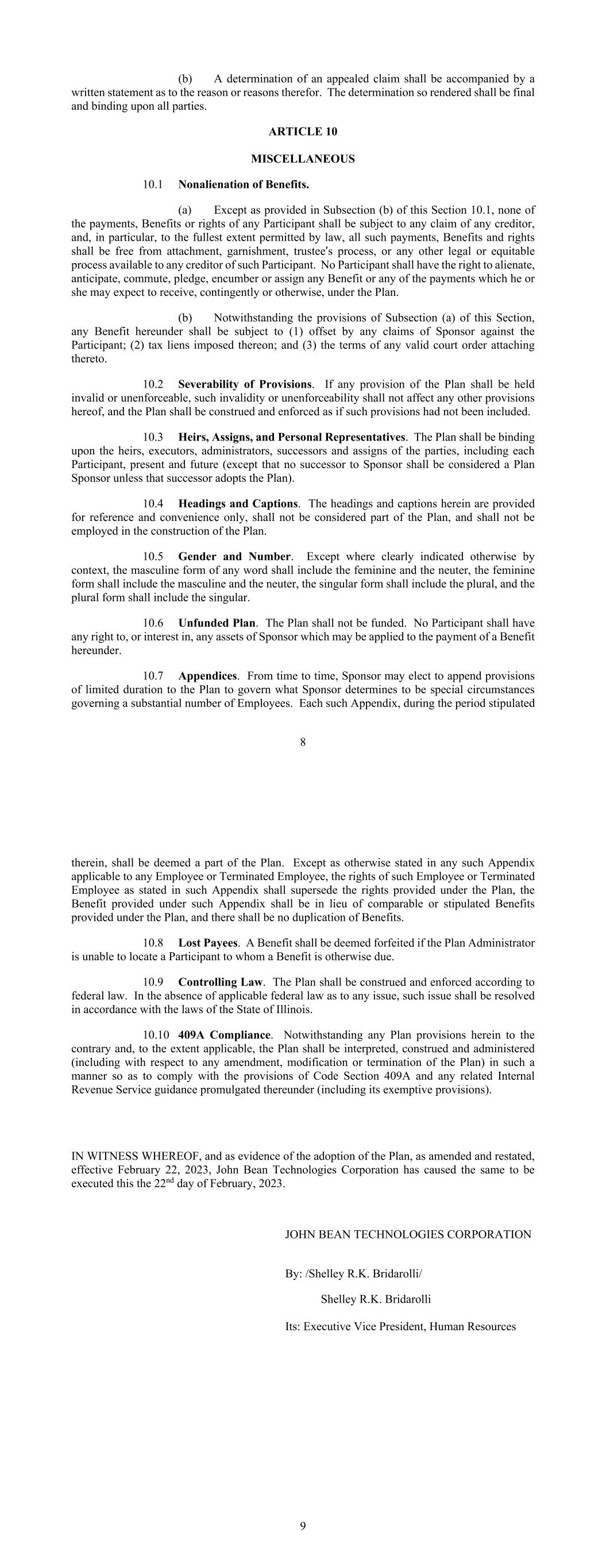8 (b) A determination of an appealed claim shall be accompanied by a written statement as to the reason or reasons therefor. The determination so rendered shall be final and binding upon all parties. ARTICLE 10 MISCELLANEOUS 10.1 Nonalienation of Benefits. (a) Except as provided in Subsection (b) of this Section 10.1, none of the payments, Benefits or rights of any Participant shall be subject to any claim of any creditor, and, in particular, to the fullest extent permitted by law, all such payments, Benefits and rights shall be free from attachment, garnishment, trustee’s process, or any other legal or equitable process available to any creditor of such Participant. No Participant shall have the right to alienate, anticipate, commute, pledge, encumber or assign any Benefit or any of the payments which he or she may expect to receive, contingently or otherwise, under the Plan. (b) Notwithstanding the provisions of Subsection (a) of this Section, any Benefit hereunder shall be subject to (1) offset by any claims of Sponsor against the Participant; (2) tax liens imposed thereon; and (3) the terms of any valid court order attaching thereto. 10.2 Severability of Provisions. If any provision of the Plan shall be held invalid or unenforceable, such invalidity or unenforceability shall not affect any other provisions hereof, and the Plan shall be construed and enforced as if such provisions had not been included. 10.3 Heirs, Assigns, and Personal Representatives. The Plan shall be binding upon the heirs, executors, administrators, successors and assigns of the parties, including each Participant, present and future (except that no successor to Sponsor shall be considered a Plan Sponsor unless that successor adopts the Plan). 10.4 Headings and Captions. The headings and captions herein are provided for reference and convenience only, shall not be considered part of the Plan, and shall not be employed in the construction of the Plan. 10.5 Gender and Number. Except where clearly indicated otherwise by context, the masculine form of any word shall include the feminine and the neuter, the feminine form shall include the masculine and the neuter, the singular form shall include the plural, and the plural form shall include the singular. 10.6 Unfunded Plan. The Plan shall not be funded. No Participant shall have any right to, or interest in, any assets of Sponsor which may be applied to the payment of a Benefit hereunder. 10.7 Appendices. From time to time, Sponsor may elect to append provisions of limited duration to the Plan to govern what Sponsor determines to be special circumstances governing a substantial number of Employees. Each such Appendix, during the period stipulated 9 therein, shall be deemed a part of the Plan. Except as otherwise stated in any such Appendix applicable to any Employee or Terminated Employee, the rights of such Employee or Terminated Employee as stated in such Appendix shall supersede the rights provided under the Plan, the Benefit provided under such Appendix shall be in lieu of comparable or stipulated Benefits provided under the Plan, and there shall be no duplication of Benefits. 10.8 Lost Payees. A Benefit shall be deemed forfeited if the Plan Administrator is unable to locate a Participant to whom a Benefit is otherwise due. 10.9 Controlling Law. The Plan shall be construed and enforced according to federal law. In the absence of applicable federal law as to any issue, such issue shall be resolved in accordance with the laws of the State of Illinois. 10.10 409A Compliance. Notwithstanding any Plan provisions herein to the contrary and, to the extent applicable, the Plan shall be interpreted, construed and administered (including with respect to any amendment, modification or termination of the Plan) in such a manner so as to comply with the provisions of Code Section 409A and any related Internal Revenue Service guidance promulgated thereunder (including its exemptive provisions). IN WITNESS WHEREOF, and as evidence of the adoption of the Plan, as amended and restated, effective February 22, 2023, John Bean Technologies Corporation has caused the same to be executed this the 22nd day of February, 2023. JOHN BEAN TECHNOLOGIES CORPORATION By: /Shelley R.K. Bridarolli/ Shelley R.K. Bridarolli Its: Executive Vice President, Human Resources