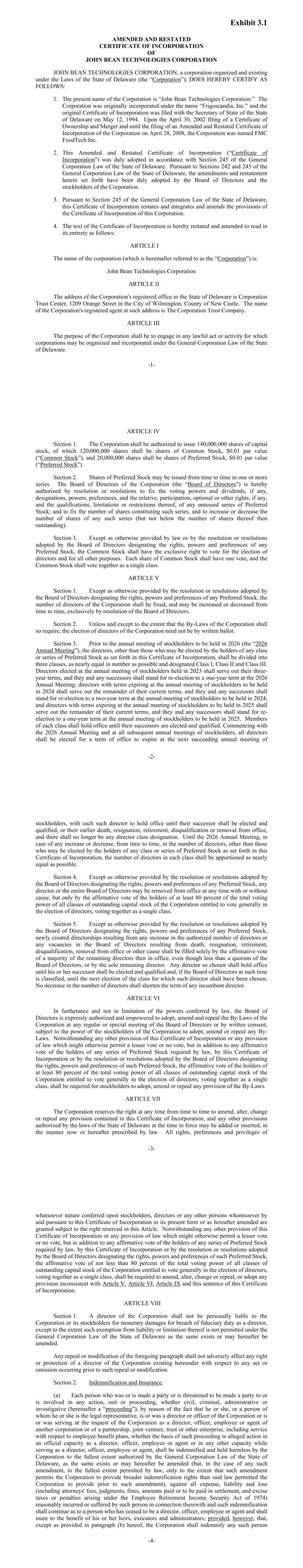 -5- seeking indemnification in connection with a proceeding (or part thereof) initiated by such person only if such proceeding (or part thereof) was authorized by the Board. The right to indemnification conferred in this Section shall be a contract right and shall include the right to be paid by the Corporation the expenses incurred in defending any such proceeding in advance of its final disposition; provided, however, that, if the General Corporation Law of the State of Delaware requires, the payment of such expenses incurred by a director or officer in his or her capacity as a director or officer (and not in any other capacity in which service was or is rendered by such person while a director or officer, including, without limitation, service to an employee benefit plan) in advance of the final disposition of a proceeding, shall be made only upon delivery to the Corporation of an undertaking, by or on behalf of such director or officer, to repay all amounts so advanced if it shall ultimately be determined that such director or officer is not entitled to be indemnified under this Section or otherwise. The Corporation may, by action of the Board, provide indemnification to employees and agents of the Corporation with the same scope and effect as the foregoing indemnification of directors and officers. (b) If a claim under paragraph (a) of this Section is not paid in full by the Corporation within thirty days after a written claim has been received by the Corporation, the claimant may at any time thereafter bring suit against the Corporation to recover the unpaid amount of the claim and, if successful in whole or in part, the claimant shall be entitled to be paid also the expense of prosecuting such claim. It shall be a defense to any such action (other than an action brought to enforce a claim for expenses incurred in defending any proceeding in advance of its final disposition where the required undertaking, if any is required, has been tendered to the Corporation) that the claimant has not met the standards of conduct which make it permissible under the General Corporation Law of the State of Delaware for the Corporation to indemnify the claimant for the amount claimed, but the burden of proving such defense shall be on the Corporation. Neither the failure of the Corporation (including its Board, independent legal counsel, or its stockholders) to have made a determination prior to the commencement of such action that indemnification of the claimant is proper in the circumstances because he or she has met the applicable standard of conduct set forth in the General Corporation Law of the State of Delaware, nor an actual determination by the Corporation (including its Board, independent legal counsel, or its stockholders) that the claimant has not met such applicable standard of conduct, shall be a defense to the action or create a presumption that the claimant has not met the applicable standard of conduct. (c) The right to indemnification and the payment of expenses incurred in defending a proceeding in advance of its final disposition conferred in this Section shall not be exclusive of any other right which any person may have or hereafter acquire under any statute, provision of the Certificate of Incorporation, By-law, agreement, vote of stockholders or disinterested directors or otherwise. (d) The Corporation may maintain insurance, at its expense, to protect itself and any director, officer, employee or agent of the Corporation or another corporation, partnership, joint venture, trust or other enterprise against any such expense, liability or loss, whether or not the Corporation would have the power to indemnify such person against such expense, liability or loss under the General Corporation Law of the State of Delaware. -6- ARTICLE IX Any action required or permitted to be taken by stockholders may be effected only at a duly called annual or special meeting of stockholders and may not be effected by a written consent or consents by stockholders in lieu of such a meeting. Except as otherwise required by law or provided by the resolution or resolutions adopted by the Board of Directors designating the rights, powers and preferences of any Preferred Stock, special meetings of stockholders of the Corporation may be called only by the Board of Directors pursuant to a resolution approved by a majority of the entire Board of Directors and any power of stockholders to call a special meeting is specifically denied. No business other than that stated in the notice of the special meeting shall be transacted at any special meeting. -7- IN WITNESS WHEREOF, John Bean Technologies Corporation has caused this Amended and Restated Certificate of Incorporation to be executed by James L. Marvin, its Executive Vice President, General Counsel and Assistant Corporate Secretary, this 12th day of May, 2023. /s/ James L. Marvin Name: James L. Marvin Title: Executive Vice President, General Counsel and Assistant Corporate Secretary