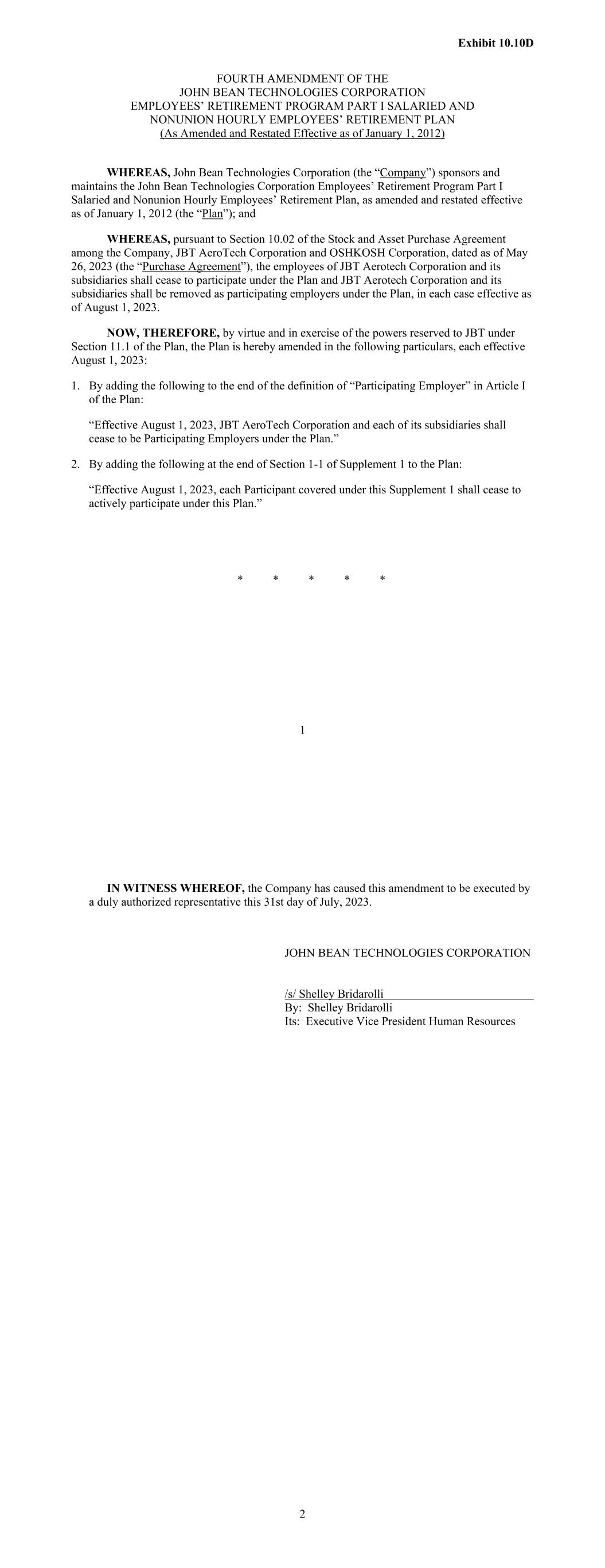 Exhibit 10.10D 1 FOURTH AMENDMENT OF THE JOHN BEAN TECHNOLOGIES CORPORATION EMPLOYEES’ RETIREMENT PROGRAM PART I SALARIED AND NONUNION HOURLY EMPLOYEES’ RETIREMENT PLAN (As Amended and Restated Effective as of January 1, 2012) WHEREAS, John Bean Technologies Corporation (the “Company”) sponsors and maintains the John Bean Technologies Corporation Employees’ Retirement Program Part I Salaried and Nonunion Hourly Employees’ Retirement Plan, as amended and restated effective as of January 1, 2012 (the “Plan”); and WHEREAS, pursuant to Section 10.02 of the Stock and Asset Purchase Agreement among the Company, JBT AeroTech Corporation and OSHKOSH Corporation, dated as of May 26, 2023 (the “Purchase Agreement”), the employees of JBT Aerotech Corporation and its subsidiaries shall cease to participate under the Plan and JBT Aerotech Corporation and its subsidiaries shall be removed as participating employers under the Plan, in each case effective as of August 1, 2023. NOW, THEREFORE, by virtue and in exercise of the powers reserved to JBT under Section 11.1 of the Plan, the Plan is hereby amended in the following particulars, each effective August 1, 2023: 1. By adding the following to the end of the definition of “Participating Employer” in Article I of the Plan: “Effective August 1, 2023, JBT AeroTech Corporation and each of its subsidiaries shall cease to be Participating Employers under the Plan.” 2. By adding the following at the end of Section 1-1 of Supplement 1 to the Plan: “Effective August 1, 2023, each Participant covered under this Supplement 1 shall cease to actively participate under this Plan.” * * * * * 2 IN WITNESS WHEREOF, the Company has caused this amendment to be executed by a duly authorized representative this 31st day of July, 2023. JOHN BEAN TECHNOLOGIES CORPORATION /s/ Shelley Bridarolli By: Shelley Bridarolli Its: Executive Vice President Human Resources