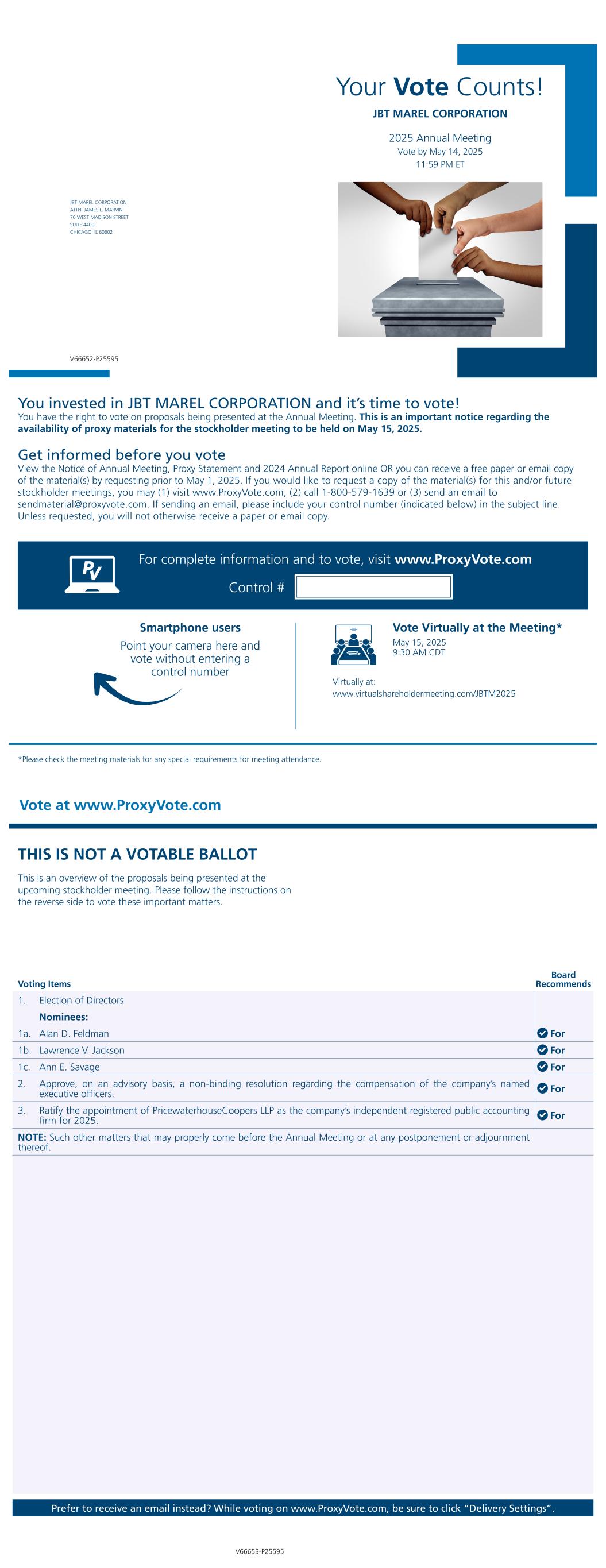 Your Vote Counts! You invested in JBT MAREL CORPORATION and it’s time to vote! You have the right to vote on proposals being presented at the Annual Meeting. This is an important notice regarding the availability of proxy materials for the stockholder meeting to be held on May 15, 2025. *Please check the meeting materials for any special requirements for meeting attendance. Smartphone users Point your camera here and vote without entering a control number For complete information and to vote, visit www.ProxyVote.com Control # V66652-P25595 JBT MAREL CORPORATION ATTN: JAMES L. MARVIN 70 WEST MADISON STREET SUITE 4400 CHICAGO, IL 60602 JBT MAREL CORPORATION 2025 Annual Meeting Vote by May 14, 2025 11:59 PM ET Get informed before you vote View the Notice of Annual Meeting, Proxy Statement and 2024 Annual Report online OR you can receive a free paper or email copy of the material(s) by requesting prior to May 1, 2025. If you would like to request a copy of the material(s) for this and/or future stockholder meetings, you may (1) visit www.ProxyVote.com, (2) call 1-800-579-1639 or (3) send an email to sendmaterial@proxyvote.com. If sending an email, please include your control number (indicated below) in the subject line. Unless requested, you will not otherwise receive a paper or email copy. Vote Virtually at the Meeting* May 15, 2025 9:30 AM CDT Virtually at: www.virtualshareholdermeeting.com/JBTM2025 THIS IS NOT A VOTABLE BALLOT This is an overview of the proposals being presented at the upcoming stockholder meeting. Please follow the instructions on the reverse side to vote these important matters. Vote at www.ProxyVote.com Prefer to receive an email instead? While voting on www.ProxyVote.com, be sure to click “Delivery Settings”. Voting Items Board Recommends V66653-P25595 1. Election of Directors Nominees: 1a. Alan D. Feldman For 1b. Lawrence V. Jackson For 1c. Ann E. Savage For 2. Approve, on an advisory basis, a non-binding resolution regarding the compensation of the company’s named executive officers. For 3. Ratify the appointment of PricewaterhouseCoopers LLP as the company’s independent registered public accounting firm for 2025. For NOTE: Such other matters that may properly come before the Annual Meeting or at any postponement or adjournment thereof.