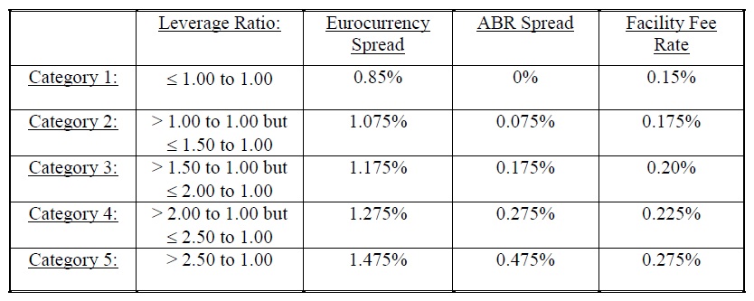 In November 2012, we entered into a $300 million 5-year credit agreement with JP Morgan Chase Bank, N.A. as Administrative Agent (“the Agreement”). We filed a copy of the Agreement as an exhibit to the Form 8-K filed December 3, 2012, reporting our entry into a material definitive agreement. Under the terms of the Agreement, the interest rate charged on borrowings is reset quarterly, with the rate determined by our leverage ratio as of the end of the previous fiscal quarter (“Leverage Ratio”). The Agreement provides stated spread rates that are to be added to the base rate in determining the interest rate to be applied in calculating interest payable on all outstanding borrowings. The applicable spread rate, as well as the facility fee rate, reset each quarter based on our actual Leverage Ratio. Specifically, the Agreement provides that higher rates are to be applied as the Leverage Ratio increases, as follows: