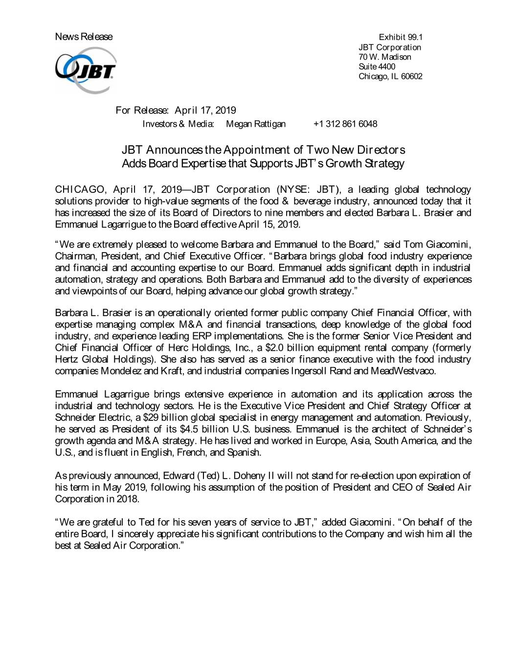 News Release Exhibit 99.1 JBT Corporation 70 W. Madison Suite 4400 Chicago, IL 60602 For Release: April 17, 2019 Investors & Media: Megan Rattigan +1 312 861 6048 JBT Announces the Appointment of Two New Directors Adds Board Expxpertise that Supports JBT’s Growth Strategy CHICAGO, April 17, 2019—JBT Corporation (NYSE: JBT), a leading global technology solutions provider to high-value segments of the food & beverage industry, announced today that it has increased the size of its Board of Directors to nine members and elected Barbara L. Brasier and Emmanuel Lagarrigue to the Board effective April 15, 2019. “We are extremely pleased to welcome Barbara and Emmanuel to the Board,” said Tom Giacomini, Chairman, President, and Chief Executive Officer. “Barbara brings global food industry experience and financial and accounting expertise to our Board. Emmanuel adds significant depth in industrial automation, strategy and operations. Both Barbara and Emmanuel add to the diversity of experiences and viewpoints of our Board, helping advance our global growth strategy.” Barbara L. Brasier is an operationally oriented former public companny Chief Financial Officer, with expertise managing complex M&A and financial transactions, deep knowledge of the global food industry, and experience leading ERP implementations. She is the former Senior Vice President and Chief Financial Officer of Herc Holdings, Inc., a $2.0 billion equipment rental company (formerly Hertz Global Holdings). She also has served as a senior finance executive with the food industry companies Mondelez and Kraft, and industrial companies Ingersoll Rand and MeadWestvaco. Emmanuel Lagarrigue brings extensive experience in automation and its application across the industrial and technology sectors. He is the Executive Vice President and Chief Strategy Officer at Schneider Electric, a $29 billion global specialist in energy management and automation. Previously, he served as President of its $4.5 billion U.S. business. Emmanuel is the architect of Schneider’s growth agenda and M&A strategy. He has lived and worked in Europe, Asia, South America, and the U.S., and is fluent in English, French, and Spanish. As previously announced, Edward (Ted) L. Doheny II will not stand for re-election upon expiration of his term in May 2019, following his assumption of the position of President and CEO of Sealed Air Corporation in 2018. “We are grateful to Ted for his seven years of service to JBT,” added Giacomini. “On behalf of the entire Board, I sincerely appreciate his significant contributions to the Company and wish him all the best at Sealed Air Corporation.”